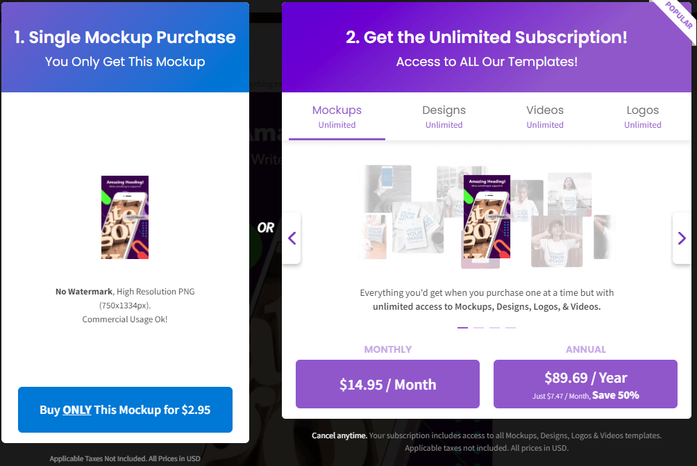 You can buy a single mockup for $2.95 or get an unlimited subscription for $14.95 a month or $89.60 a year and get access to all Placeit templates.