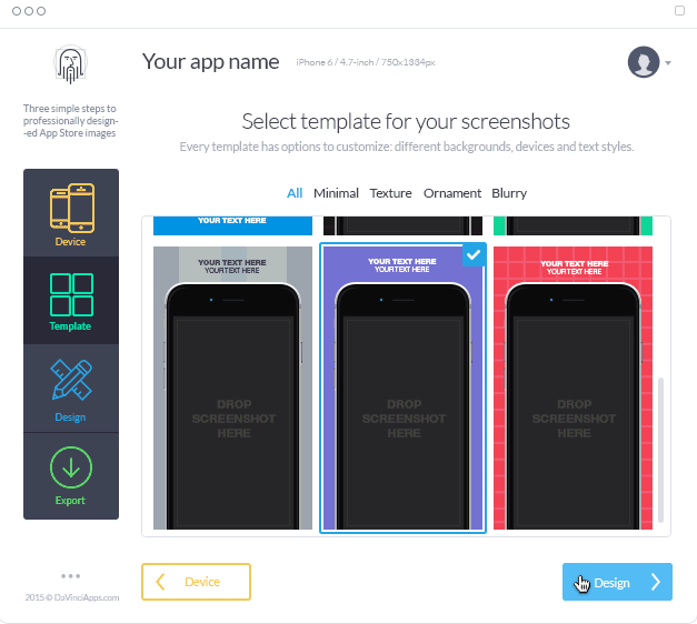 You can choose from dozens of templates based on popular and successful apps, as well as unlimited layout options, and simply upload your screenshots. Furthermore, you can choose between landscape or portrait orientation.
