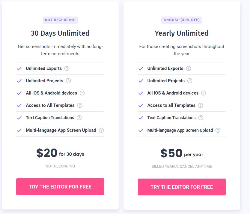 Finally, a big deciding factor is pricing. Even though app store screenshot generators are not as expensive as hiring a professional designer, you still need to consider your budget.