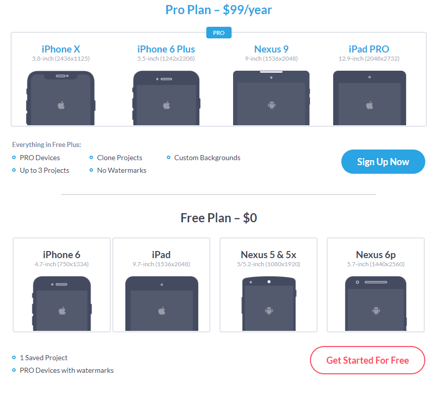 - Free plan – with the free plan, you get one saved project and pro devices with watermarks.