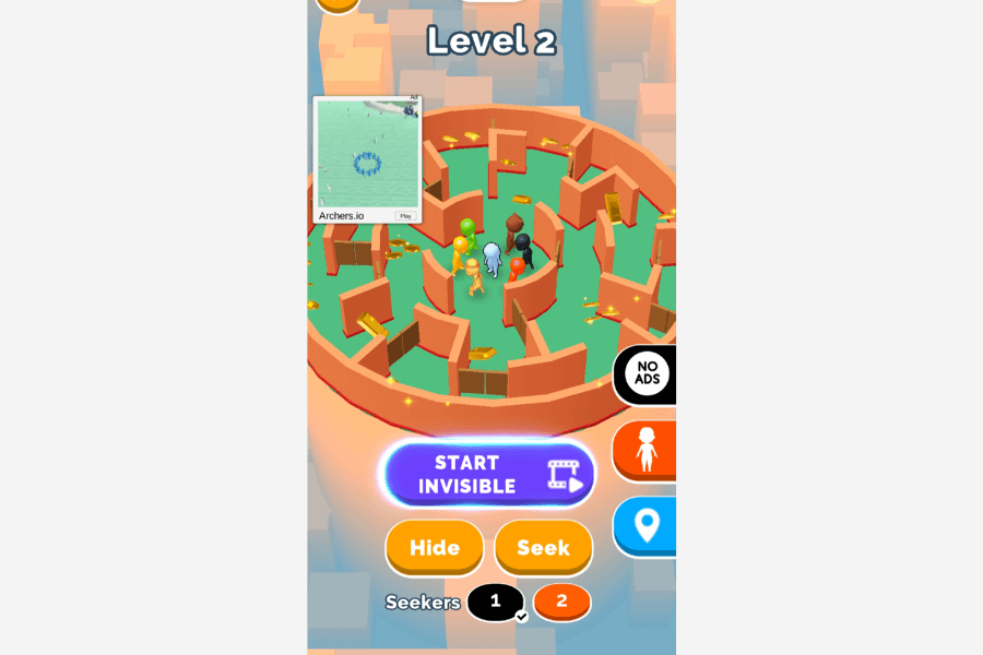 During 5 minutes of gameplay, the Hide ‘N Seek displayed only 3 interstitial ads. The game puts a bigger focus on rewarded video ads which bring players great advantages.